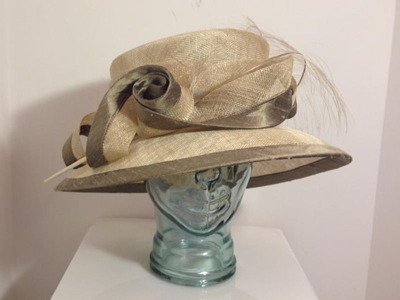 OROGINAL PRICE £230 - This is a beautiful medium sized hat that is edged with bronze silk. The crown is covered with layers of oatmeal sinamay and bronze silk. Waves are carefully situated around the hat while a large ostrich quill swoops across the front of this stunning hat. Because of the exquisite shape and colours, this hat is perfect to wear to a wedding or for a day at the races.